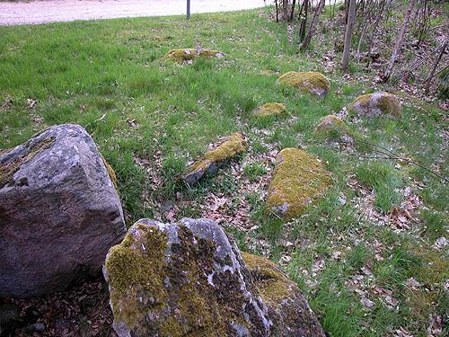 Kun 3 sten er bevaret i kammergangen. I forgrunden 2 af de 28 randsten hvor gangen udmundede.