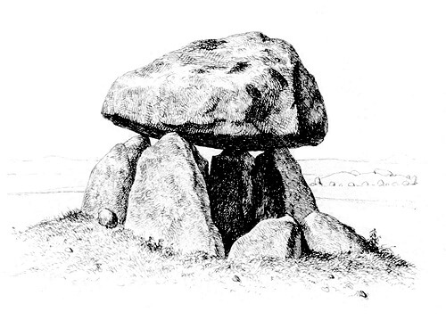Mejdkirke-dyssen set fra øst. Udenfor kammeret de to bevarede bæresten fra kammergangen.